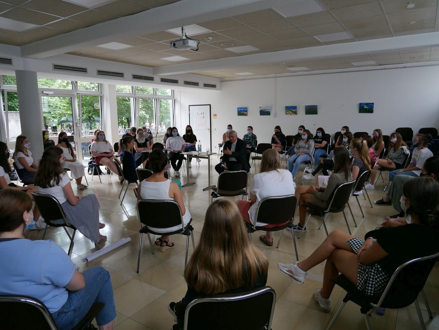 Vor der Feierlichkeit nutzte Bischof Wiesemann die Gelegenheit, sich mit Schülerinnen im Franziskussaal über den Schulalltag und aktuelle Fragen auszutauschen. Beeindruckt zeigte er sich von den zahlreichen Arbeitsgemeinschaften, in denen sich die Schülerinnen neben dem Unterricht engagieren. Zur Sprache kamen unter anderem Arbeitskreise zur Umwelt und zur Bewahrung der Schöpfung, zur Schulmusik und zum Schulgottesdienst, zu sozialen Projekten und zum Poppy Day, einem Kriegsgedenktag.