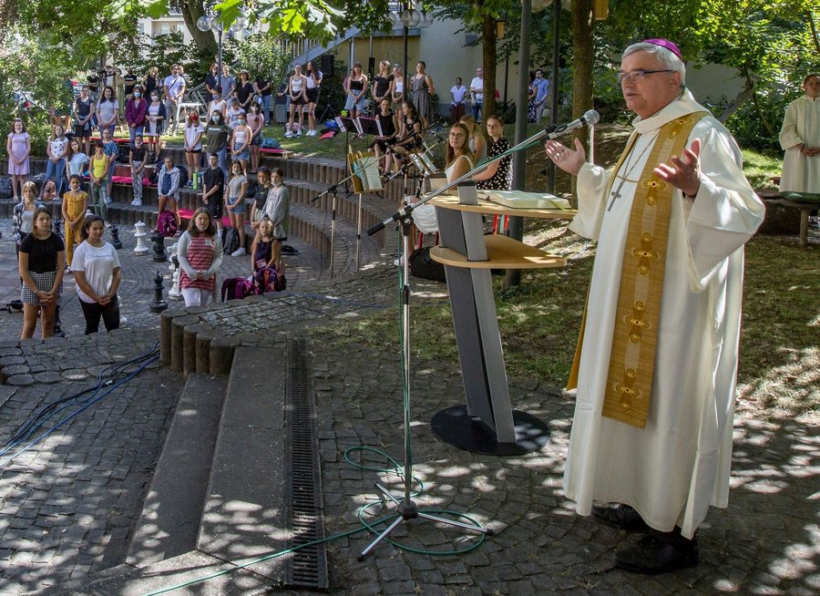 Schülerinnen, Kollegium, Elternvertreter und Ehrengäste feierten im Schulhof einen Gottesdienst mit Bischof Dr. Karl-Heinz Wiesemann.