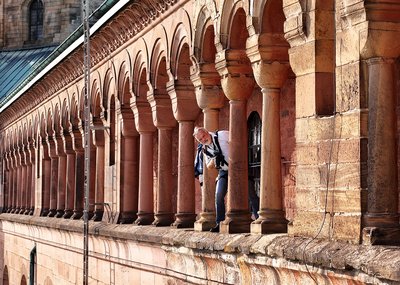 Den Fotografen Horst Hamann fasziniert der Dom seit Jugend an. Aufgewachsen ist er im nahen Mannheim. Über mehr als ein Jahr hinweg nahm er nun die Speyerer Kathedrale immer wieder neu in den Blick. „Der Dom ist nach der aufgehenden Sonne ausgerichtet und die Veränderungen des Lichts im Tagesverlauf spielen bei seiner Betrachtung eine große Rolle. Je nach Jahreszeit und Lichtstimmung kann die ein und selbe Perspektive sehr, sehr unterschiedlich wirken, so dass man ganz neue Details und Facetten des Baus wahrnimmt“, schildert der Fotograf seine Arbeit. „Die Beschäftigung mit dem Dom und seinen alten Mauern ist für mich unglaublich faszinierend und ich hoffe, dass ich diese Faszination in meinen Bildern auf den Betrachter übertragen kann“, sagt Horst Hamann zu dem Projekt. Seit September 2023 fotografiert er am Dom und war, nach eigener Schätzung, bereits 30 bis 40 Mal vor Ort und will noch einmal so oft mit seiner Kamera dorthin kommen. Langweilig wird es ihm bei dem Projekt nicht, auch wenn er sich, im Gegensatz zu seinen sonstigen Arbeiten, auf ein einziges Gebäude konzentriert. Durch seine Reisen kehre er immer wieder mit einem frischen Blick zurück und bekomme „immer wieder magische Momente geschenkt“. Um Fotos mit Schnee zu bekommen, habe er sogar eine Reise abgebrochen.