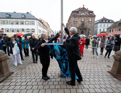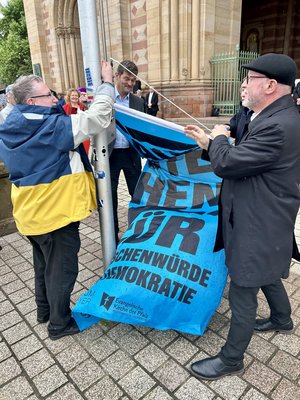 Speyer. Aufstehen für Menschenwürde und Demokratie – unter diesem Motto starteten am 17. Mai das Bistum Speyer und die Evangelische Kirche der Pfalz ihre gemeinsame Initiative. Vor dem Dom hissten Bischof Wiesemann und Kirchenpräsidentin Wüst die ersten Flaggen der Kampagne.
