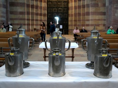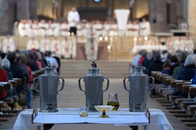 Die drei zu weihenden Öle, Kranken-, Katechumenen- und Chrisam-Öl, wurden während der Messe, begleitet von Gesang, in kleinen Prozessionen durch den Dom nach vorne zum Altar getragen. Üblicherweise übernehmen Diakone diese Aufgabe – in diesem Jahr gab es hier eine Neuerung. So wurde das Öl für die Kranken von vier Trägern aus dem Feld der Krankenhausseelsorge zum Altar gebracht; sie sind in der BG Klinik und im Städtischen Krankenhaus Ludwigshafen sowie im Kreiskrankenhaus Grünstadt tätig. Das Krankenöl dient der Salbung Kranker und Sterbender. „Da will Christus da sein, da will er uns innerlich stärken, da will er in unserem Leben die Kraft sein, die uns den Mut zur letzten Hingabe gibt“, so Wiesemann.