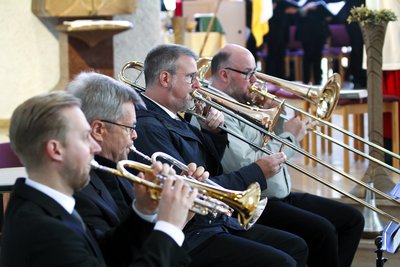 Zum Auftakt der Heiligen Messe spielten die Dombläser, Pauke und Orgel die Toccata Athalanta von Aurelio Bonelli. Schon bei diesem Stück demonstrierten Klaus Wendt und Marc Kienle (Trompete), Daniel Regending und Marek Janicki (Posaune), Dominique Civilotti (Pauke) zusammen mit Gerhard Jentschke (Orgel) ihr Können und gelungenes Zusammenspiel.