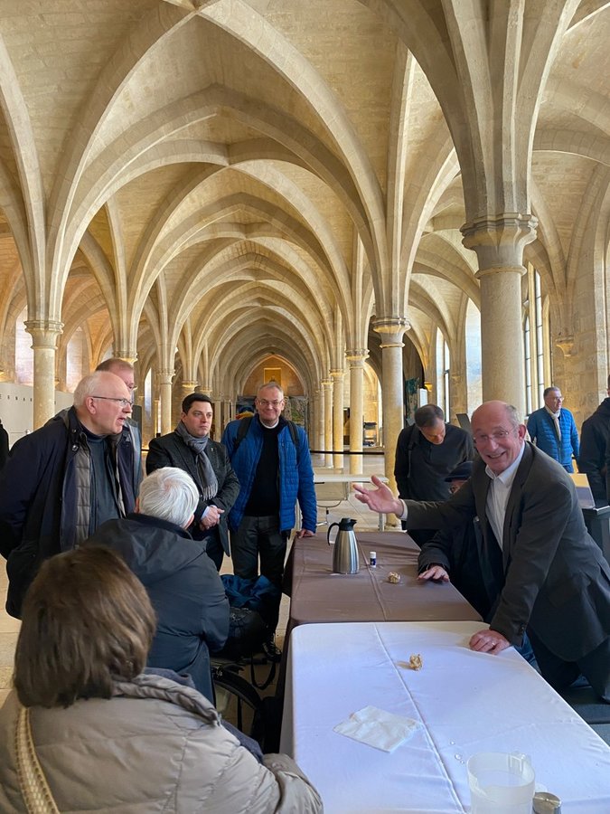 Wir durften eine dreieinhalbstündige Führung durch die Schatzkammer und die Kathedrale genießen, und haben viel über die Figuren am Süd- und Nordportal erfahren, über die Fenster, die die Theologie des 12. Jahrhunderts widerspiegeln. Nach dem Abendgebet und Abendessen erzählte Bischof Philippe über die pastorale Situation seiner Diözese. So gehöre die Kathedrale dem Staat, der für die Renovierung aufkomme, wobei die Betriebskosten das Bistum trage. Erstaunt hat, dass die Stadt Chartres keinen Euro Zuschuss für die Kathedrale gewährt, obwohl sie das Wahrzeichen der Stadt sei und jährlich circa anderthalb Millionen Besucher anziehe. Ohne die Kathedrale, deren Türme man in bis zu 30 km Entfernung sehe, wäre die überregionale Bedeutung der Stadt nicht gegeben. Es gäbe überraschend viele erwachsene Taufbewerber, die vom christlichen Glauben gehört haben und sich bewusst für ein Leben mit Gott entschieden hätten. Bischof Dr. Wiesemann übersetzte in beide Richtungen, sodass wir auch unsere Fragen stellen konnten.