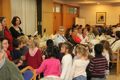 Mit dem gemeinsamen Singen von Martinsliedern stimmten sich Gäste und Bewohner auf das Festessen ein. Serviert wurden Kürbis-Creme-Suppe, Gänsebrust mit Kartoffelknödeln und Blaukraut sowie als Nachspeise Eis mit Roter Grütze.