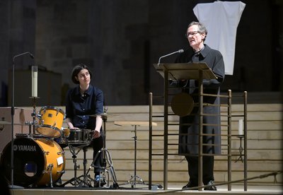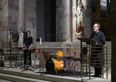 Schlagzeugerin Leonie Klein und Domdekan Dr. Christoph Kohl beim Konzert „Schlag auf Schlag“ in der Karwoche 2025 © Domkapitel Speyer, Klaus Landry