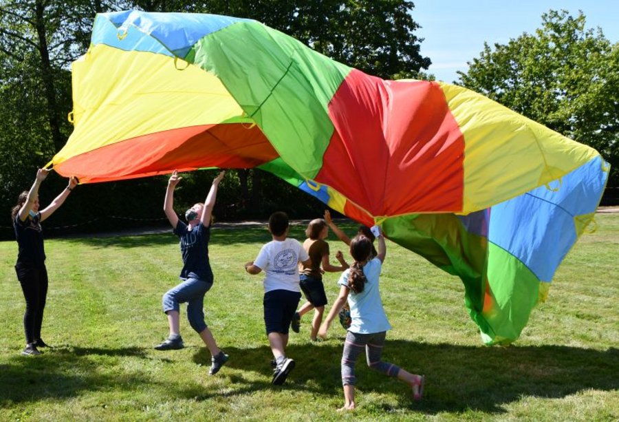 „Wir haben zum Glück viele und große Räume im HPH“, sagt Jana Sand. So sind die Kinder in Kleingruppen mit sechs bis zehn Kindern aufgeteilt – je nach Größe des Gruppenraums. Und auch der Park ist so großzügig, dass ausreichend Platz zum Spielen und Toben ist. Zum Beispiel für das „chaotische Zelt“. Die sechs quirligen Achtjährigen haben das Spiel erfunden. Ein sechs Meter großes buntes Schwungtuch benötigen sie dafür. „Wir fassen das Tuch an den Griffen, werfen es in die Luft und laufen alle darunter“, erklärt Keno das Spiel. „Und machen dann Chaos“, ergänzt Alexander.