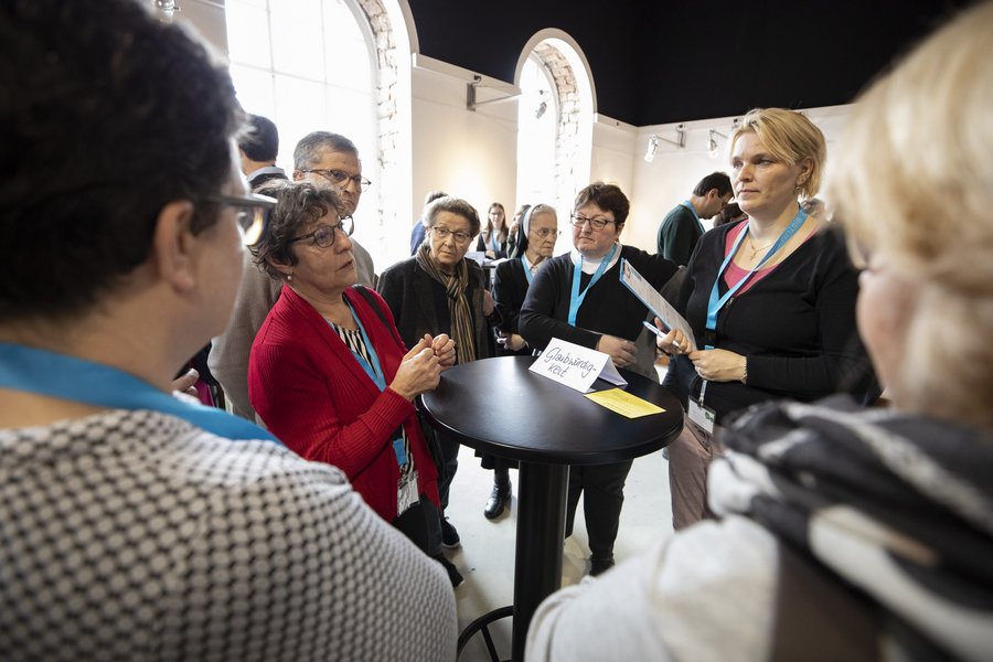 In insgesamt zwölf Gruppen wurden unter anderem über Willkommenskultur, politisches Handeln, Bildung in Kindertagesstätte und Schule, Leitung und Ehrenamt, Glaubwürdigkeit, Frauen, Jugend, Ökumene oder Leben in den Pfarreien diskutiert. In einer Runde ging es zudem um das Verhältnis von Tradition und Innovation, in einer anderem um spirituelle Erneuerung oder um kirchliche Öffentlichkeitsarbeit. „Es sind viele Themen dabei, die wichtig und zentral sind für die Zukunft in unserem Bistum“, sagte Felix Goldinger. An einem Infotisch wurde zudem über den bundesweiten „Synodalen Weg“ der katholischen Kirche in Deutschland informiert, und es konnten Meinungen zu den dortigen Themen ausgetauscht werden. „Die Leute hier legen die Finger in die Wunden“, beobachtete Generalvikar Andreas Sturm. „Und zugleich ist viel Ermutigendes und Hoffnungsvolles zu erfahren. Es sind viele Ansätze für Segensorte zu erkennen.“