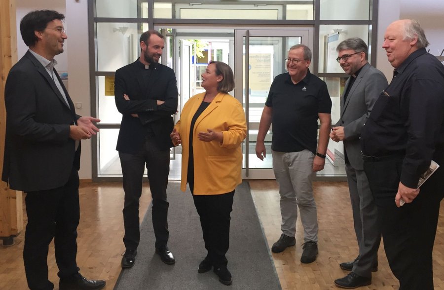 Angeregte Gespräche über das Priesterbild in den Medien, von links: Pressesprecher Markus Herr, Domvikar Tobias Heil, Ordinariatsdirektorin Christine Lambrich, Diakon Mathias Reitnauer, Dekan Steffen Kühn und Pfarrer Bernhard Spieß.