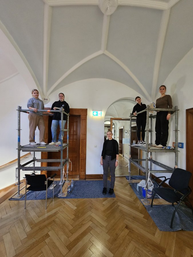 „Es ist schön die Möglichkeit zu haben, hier etwas Neues auszuprobieren.“, so Schülerin Clara. Während die Arbeit mit der Temperafarbe noch gut von der Hand ging, war der Umgang mit dem Blattgold deutlich schwieriger, berichten die Schülerinnen. So gab es zu Beginn Probleme, das Material gut zu befestigen. „Dass ausgerechnet unser Grundkurs ausgewählt wurde, ist eine besondere Ehre – wir haben uns alle sehr darüber gefreut!“, kommentiert Schülerin Enya. Damit möglichst viele Schülerinnen an den Wandmalereien mitwirken konnten, wechselten sich Vierergruppen mit den Arbeiten auf den Gerüsten ab.
