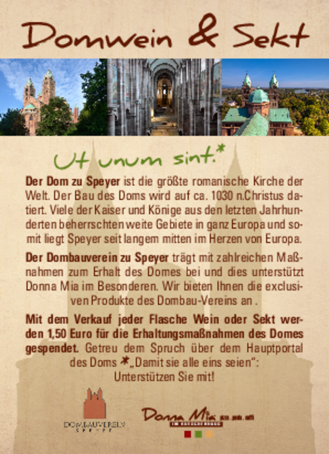 Wer den Domwein oder Domsekt im Donna Mia genießt, leistet zugleich einen Beitrag für die Restaurierung und Unterhaltung des Kaiserdoms. Denn ein Teil des Erlöses geht an den Dombauverein und wird über diesen zur Finanzierung entsprechender Maßnahmen am Dom weitergegeben!
