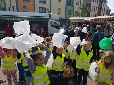 Im Rahmen des Klimaschutzprojektes fand am 18.05.2018 eine Tauschaktion "Stofftaschen gegen Plastiktüten" statt. Die Wackelzähne der Kita Herz Jesu haben auf dem Wochenmarkt den Leuten Stoffbeutel gegen Plastiktragetaschen angeboten. Die Marktbesucher und Mitarbeiter der Marktstände waren begeistert von der Idee und machten fleißig bei der Tauschaktion mit. Die gesammelten Plastiktragetaschen werden am Klimafest ausgestellt.