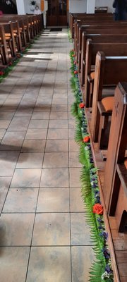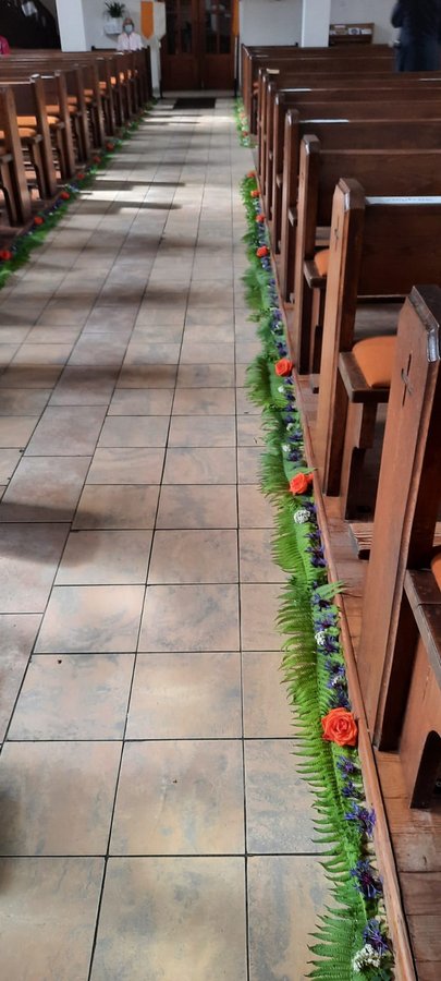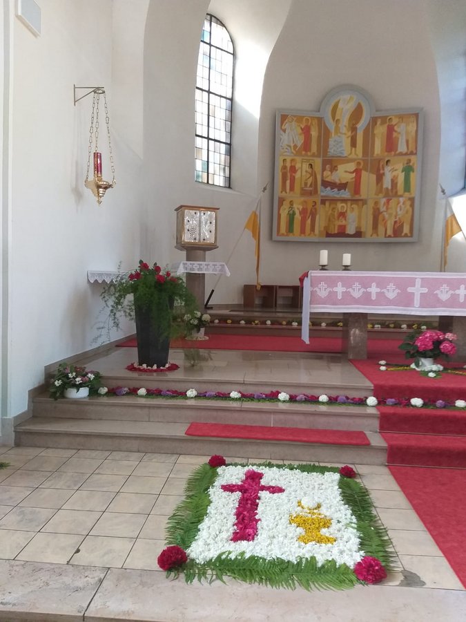 Im Innern der Kirche erwartete die Mitfeiernden der Gottesdienste prachtvoll geschmückte Kirchen. In Gersheim hatten Frauen sogar die Tradition der Blumenteppiche aufrecht erhalten. Schöne Bilder im Altarraum und ein blumengesäumter Weg zum Altar stimmte die Gottesdienstbesucherinnen und -besucher auf das Fest Fronleichnam ein.