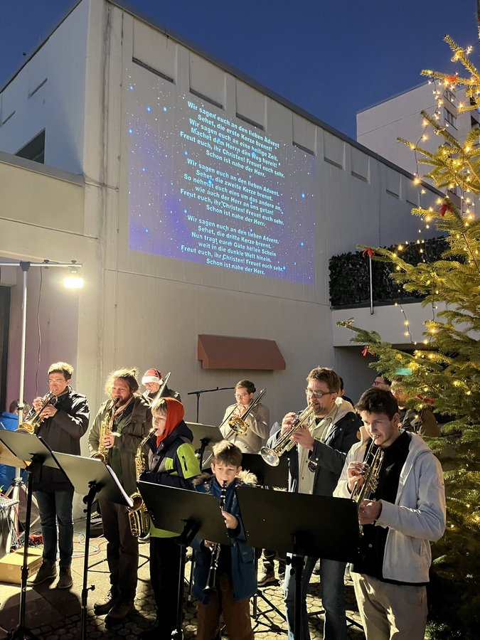 In der vergangenen Adventszeit stimmten die „Balkonbläser“ wieder an den ersten drei Adventssonntagen mit ihrer Musik die Besucher:innen auf Weihnachten ein. Dabei gab es in diesem Jahr ein paar Veränderungen. Die Musiker:innen standen diesmal nicht auf dem Balkon des ehemaligen Pfarrhauses von St. Albert, sondern darunter, auf dem davor liegenden Kirchplatz. Außerdem kamen in diesem Jahr, neben Posaunen, Klarinette, Saxophonen und Trompeten, noch Gitarren und Cajon dazu. Die bis zu 11 Instrumente spielten traditionelle Adventslieder und gemeinsam mit Gitarren und Cajon moderne adventliche NGL’s (Neues geistliches Liedgut). Am letzten Abend kamen dann noch ein paar weihnachtliche Lieder dazu. Die Texte wurden zum Mitsingen an die Wand projiziert. Am 17.12. brachten die Pfadfinder:innen das Friedenslicht, welches sie nach einem Statement und Gebet für den Frieden an die Menschen weitergaben. Entstanden sind die Balkonbläser im ersten Coronajahr 2020. Damals haben die ersten Musiker:innen begonnen ohne Publikum auf dem Balkon adventliche Lieder zu spielen, um die wohltuenden Klänge den von Kontaktbeschränkungen geplagten Menschen in die Wohnungen zu bringen. Was man sich, mit dem Anblick der über 70 Menschen die sich auf dem Kirchplatz eingefunden hatten, nicht vorstellen konnte. Zusammen mit der Musik, dem Gesang und den Texten, einem warmen Getränk und Essen waren die Veranstaltungen schöne und besinnliche Veranstaltungen.