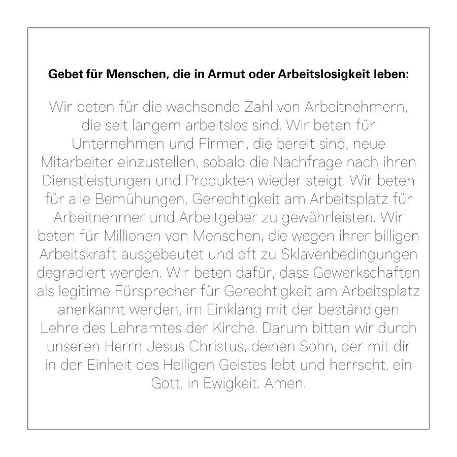 die seit langem arbeitslos sind. Wir beten für Unternehmen und Firmen, die bereit sind, neue Mitarbeiter einzustellen, sobald die Nachfrage nach ihren Dienstleistungen und Produkten wieder steigt. Wir beten für alle Bemühungen, Gerechtigkeit am Arbeitsplatz für Arbeitnehmer und Arbeitgeber zu gewährleisten. Wir beten für Millionen von Menschen, die wegen ihrer billigen Arbeitskraft ausgebeutet und oft zu Sklavenbedingungen degradiert werden. Wir beten dafür, dass Gewerkschaften als legitime Fürsprecher für Gerechtigkeit am Arbeitsplatz anerkannt werden, im Einklang mit der beständigen Lehre des Lehramtes der Kirche. Darum bitten wir durch unseren Herrn Jesus Christus, deinen Sohn, der mit dir in der Einheit des Heiligen Geistes lebt und herrscht, ein Gott, in Ewigkeit. Amen.