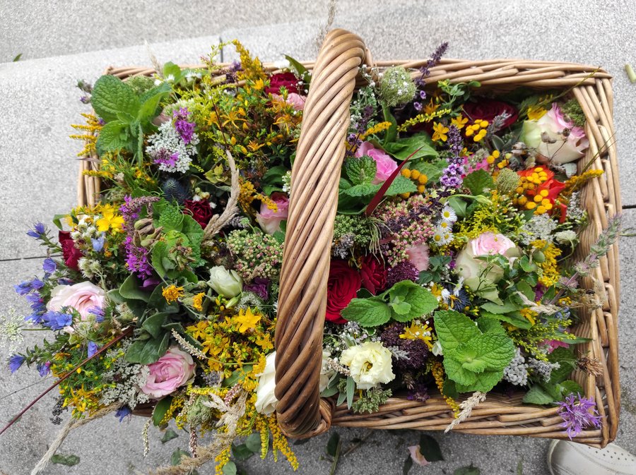 Zur Einstimmung auf Mariä Himmelfahrt hatte die kfd St. Hildegard zur Gartenandacht eingeladen. An vier Wegestationen vom Kirchenvorplatz bis auf die Pfarrwiese und zum Kräuterbogen wurde innegehalten. Wir gedachten unserer „großen“ Frauen; wie ist mein eigener Bezug zur Natur; welche Kräuter finde ich auf unserer Wiese. Ein Körpergebet und Marienlieder rundeten die Andacht ab. Nach dem Segen, den Pfr. Hook erteilte, erzählte er noch einiges über die Kräuter, die auf der Wiese wachsen. Im Anschluss gab es für alle Dinkelbrote mit verschiedenen Aufstrichen und Sangria à la Hook. Ein schöner Ausklang, den alle Anwesenden dankbar annahmen. Die Kräuter der Kirchenwiese waren wiederzufinden in den rund 120 Kräutersträußen, die am Vortag zu Mariä Himmelfahrt gepflückt und gebunden wurden und in den Gottesdiensten an der Grotte im Garten des Fidelishauses und in St. Josef geweiht und verteilt wurden. Gisela Hähner