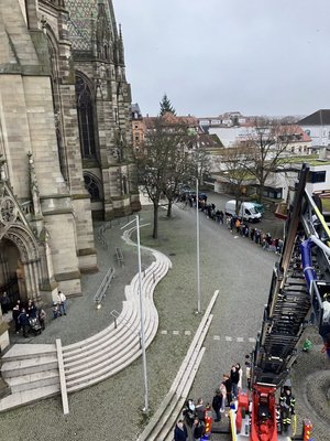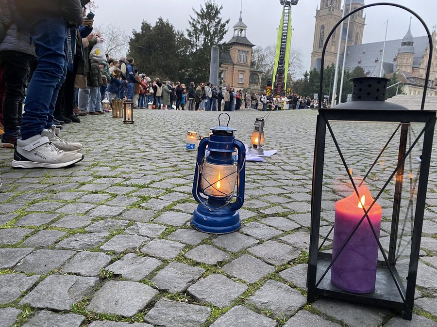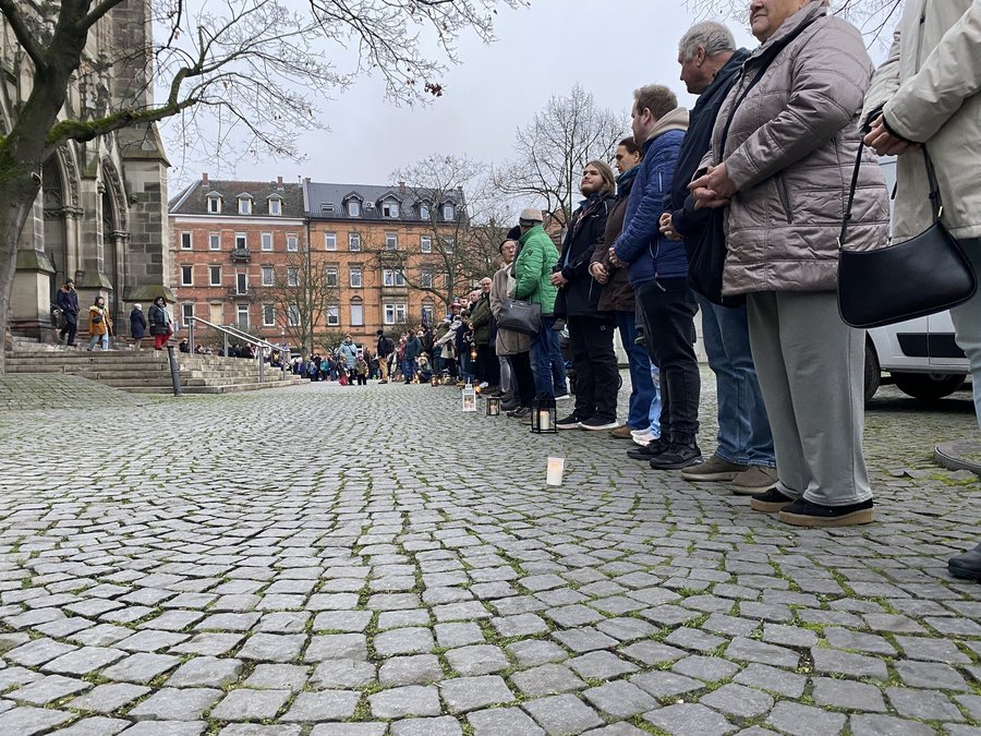 Unter dem Motto "Ein Funke Mut" bot die bunt gefüllte Kirche den Rahmen für Gebete, Musik und Gedanken, die Mut machten und Hoffnung spendeten – gerade in einer Zeit, in der Konflikte und Unsicherheiten viele Menschen bewegen. Das Friedenslicht erinnert daran, dass Frieden im Kleinen beginnt: bei jedem einzelnen Menschen und in jeder Gemeinschaft. Durch eine Menschenkette um die Gedächtniskirche herum wurde dies besonders deutlich gemacht. "Wir möchten mit dieser Geste zeigen, dass Frieden Zusammenhalt braucht und diese Botschaft nach außen tragen", erklärt Simone Eisenlohr, Mitglied der Aktionsgruppe. "Beim Friedenslicht entsteht ein ganz besonderes Gemeinschaftsgefühl und es wird spürbar, wie viele Menschen sich für ein friedliches Miteinander stark machen wollen." Mit der Unterstützung der Feuerwehr Speyer konnte dieses Ereignis aus der Höhe fotografiert und festgehalten werden.