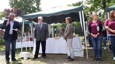 Frau Gabrielle Hellmann gratulierte für die VR-Bank. Sie dankte für die gute Zusammenarbeit und übergab einen Check mit 250Euro. Ortsvorsteher Friedrich Rentschler und Herr Bürgermeister Markus Schaile waren auch unter den Gratulanten. Herr Rentschler überbrachte in seiner Funktion als Presbyter auch die Grüße der protestantischen Kirchengemeinde. Die Stadt in Zusammenarbeit mit der Sparkasse schenkten der Kita die stattliche Summe von 400Euro. Natürlich durften auch die Geburtstagsgrüße des Gemeindeausschuss durch Vorsitzenden Thomas Schelter nicht fehlen. Ihr Geschenk war die tatkräftige Unterstützung bei der Organisation und Durchführung des anschließenden Festes.