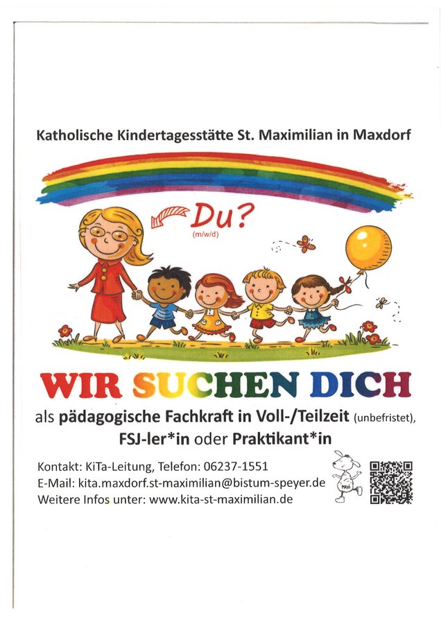 Weitere Informationen und Bewerbungen gerne unter 06237-1551 oder per Mail: kita.maxdorf.st-maximilian@bistum-speyer.de