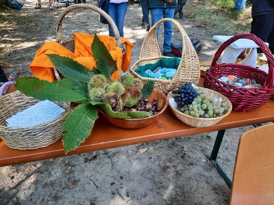 Nach dem Gottesdienst im kalten Schatten des Blätterdachs ging es auf die andere Seite der Kapelle in den warmen Sonnenschein, wo das Fest, mit dem geselligen und kulinarischen Teil, bis in den Nachmittag fortgeführt wurde. Ein herzliches Dankeschön an alle Helferinnen und Helfer, Kuchenbäckerinnen und Mitwirkende, die zum Gelingen des Festes beigetragen haben.