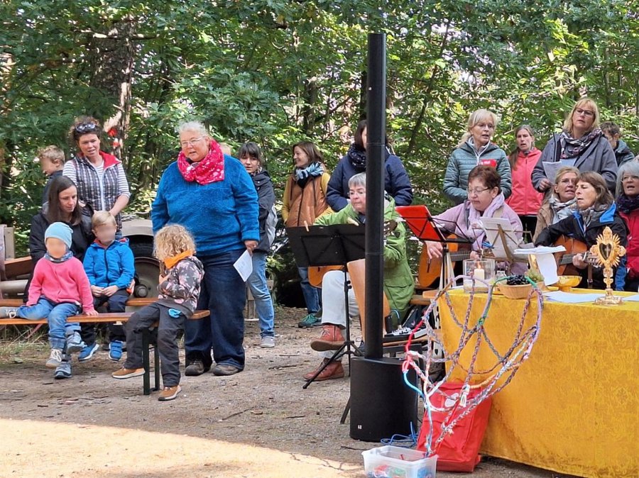 Alle fünf Gemeinden gestalteten durch Beiträge den Gottesdienst an der Michaelskapelle zum Thema "Miteinander auf dem Weg" zusammen mit den Kita's der Pfarrei, die eine eigene Kinder- Wort-Gottes-Feier anboten. Zu Beginn des Gottesdienstes wurde die neue Pastoralreferentin Sandra Petrollo-Shahtout von Pfarrer Matthias Schmitt eingeführt und von Kindern interviewt, um sie besser kennenzulernen. Die Kolpingkapelle Deidesheim und eine Gitarrengruppe aus Erzieherinnen der Kita's umrahmten den Gottesdienst musikalisch.
