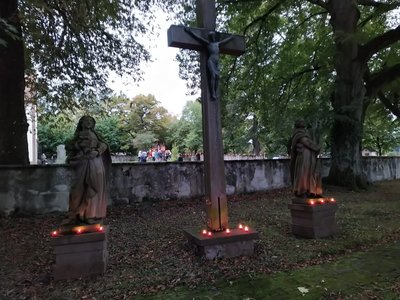 In diesem Jahr fiel das Fest Kreuzerhöhung, das am 14. September gefeiert wird, auf einen Sonntag. Da es das Patrozinium unserer "Großpfarrei" ist, begingen wir dieses Fest wieder mit einer Eucharistiefeier in Medelsheim. Danach pilgerten die Gläubigen betend zur Lourdes-Grotte bei der Kreuzkapelle. Der Kreuzweg und die Lourdes-Grotte wurden wieder mit Lichtern geschmückt, sodass eine besondere Stimmung herrschte. Vor allem schön anzusehen: die Lourdes-Grotte in der Dunkelheit, die zum Innehalten und Gebet einlud. Vielen Dank allen, die den Weg dahin und die Lourdes Grotte so schön geschmückt haben.