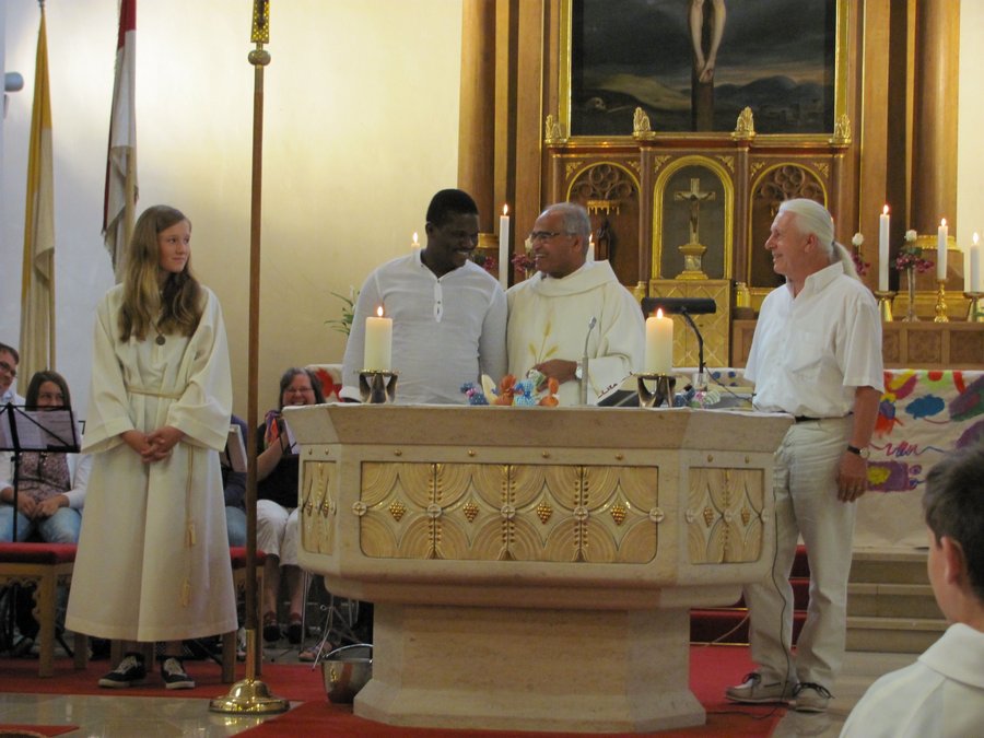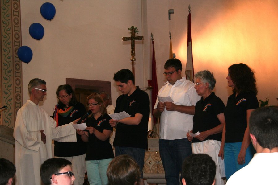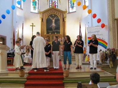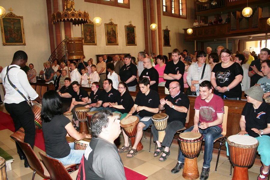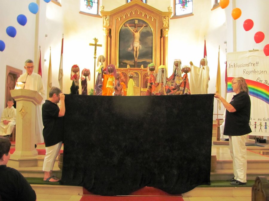 Ein festlicher und berührender Auftakt war der Gottesdienst in der kath. Kirche Lingenfeld gestaltet von Pfarrer Henry Patrao, Pastoralreferent Thomas Bauer, der Band des Familiengottesdienstkreises und nicht zuletzt den Menschen der Gruppe Regenbogen mit der Musikgruppe geleitet von Herrn Ullrich und der Trommelgruppe mit Billy Konate. Alleine der Einzug in die Kirche mit dem bemalten Tuch der Regenbogenmitglieder, dem rhytmischen, urigen Takt der afrikanischen Trommeln, dem wunderschön geschmückten Altar, den ein Bogen mit bunten Luftballons in Regenbogenfarben zierte, berührte die Gottesdienstbesucher sehr. Die Botschaft des Evangeliums wurde mit selbstgebastelten Handpuppen veranschaulicht. Gruppenmitglieder des Regenbogens haben die Fürbitten vorgelesen und die mit Sorgfalt ausgewählten Liedtexte haben den Gottesdienst zu etwas ganz Besonderem gemacht.
