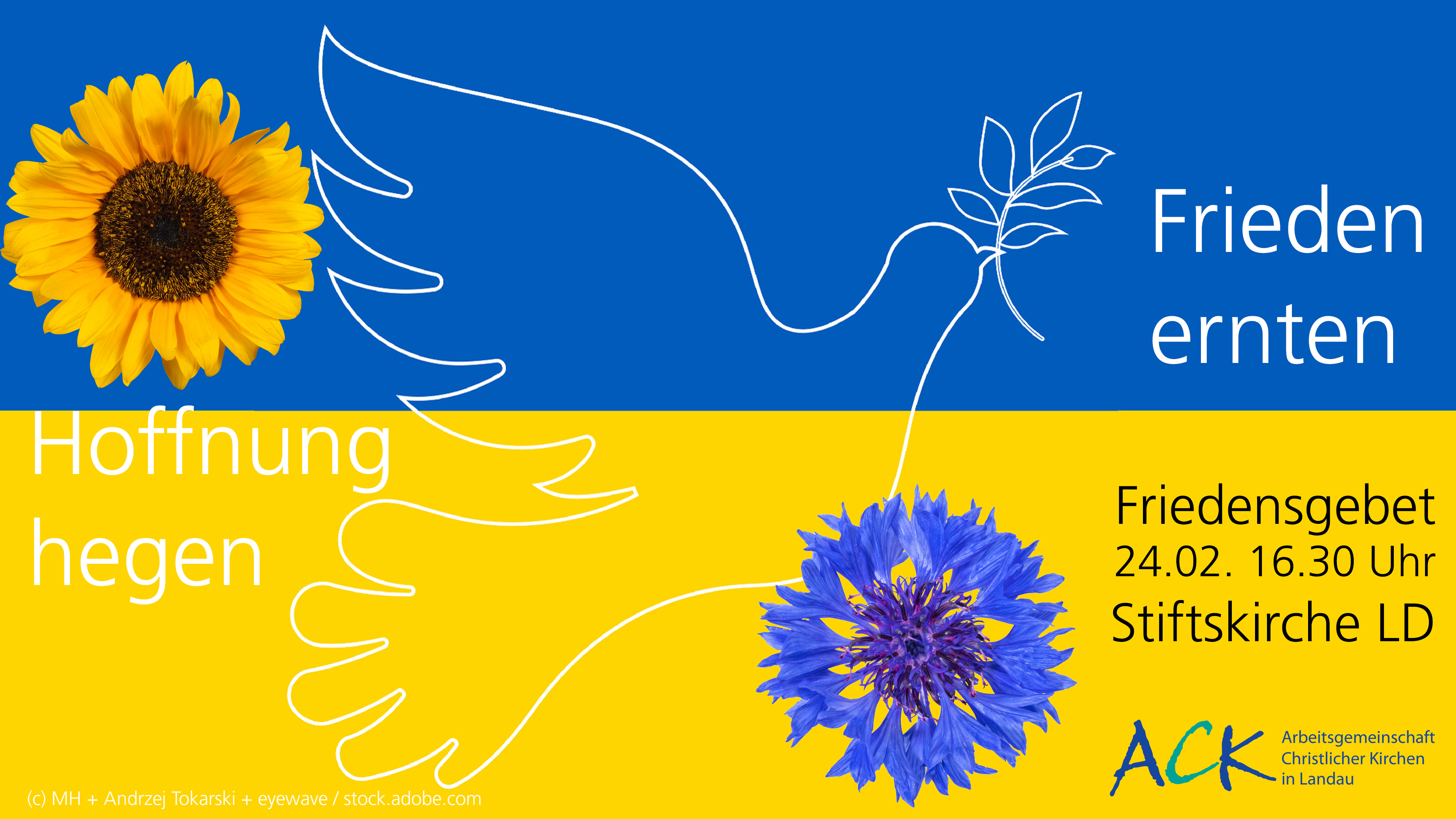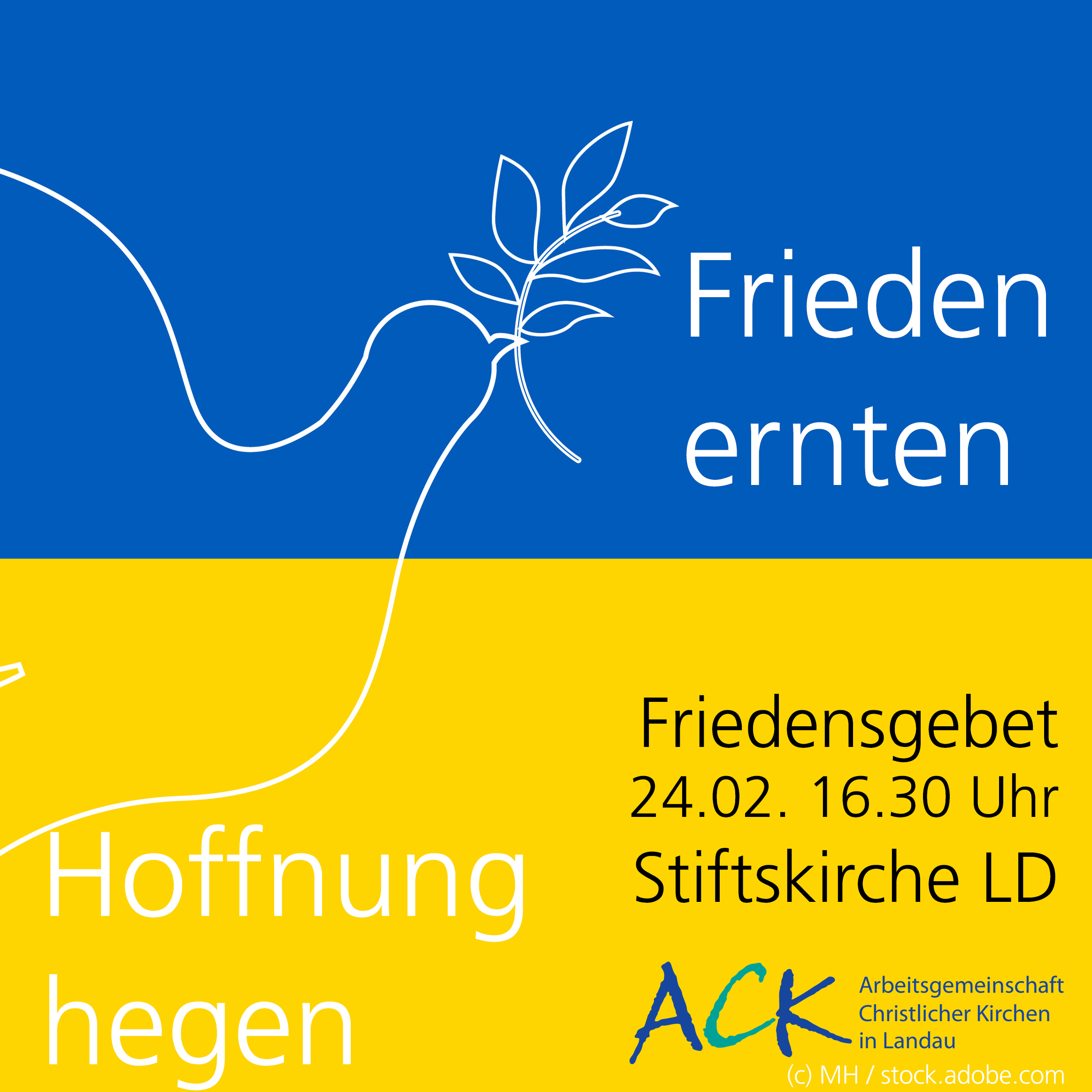 Die ACK Landau stellt das Friedensgebet in der Stiftskirche unter das Motto „Hoffnung hegen – Frieden ernten“. Denn jeder Tag Krieg ist einer zu viel. Die brutalen kriegerischen Auseinandersetzungen verletzen und töten Menschen, nehmen Heimat und Sicherheit, zerstören Lebensgrundlagen und verwüsten Städte, Dörfer und Landschaften. Teilnehmerinnen und Teilnehmer des Friedensgebetes sind eingeladen, Klage, Sorge und die Hoffnung auf Frieden vor Gott zu bringen.