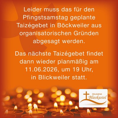 Das für Pfingstsamstag geplante Taizé-Gebet in Böckweiler muss leider aus organisatorischen Gründen abgesagt werden. Das nächste Taizé-Gebet findet dann wieder planmäßig am 11.06.2026, um 19 Uhr, in Blickweiler statt.