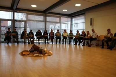 Dann erst öffnet sich die Tür zum Saal, der Blick wird frei auf einen riesigen Stuhlkreis und die Mitte mit einem Brotkorb, mehreren Brotlaiben, stilisierten Fischen und Kerzen sowie der Bibel.