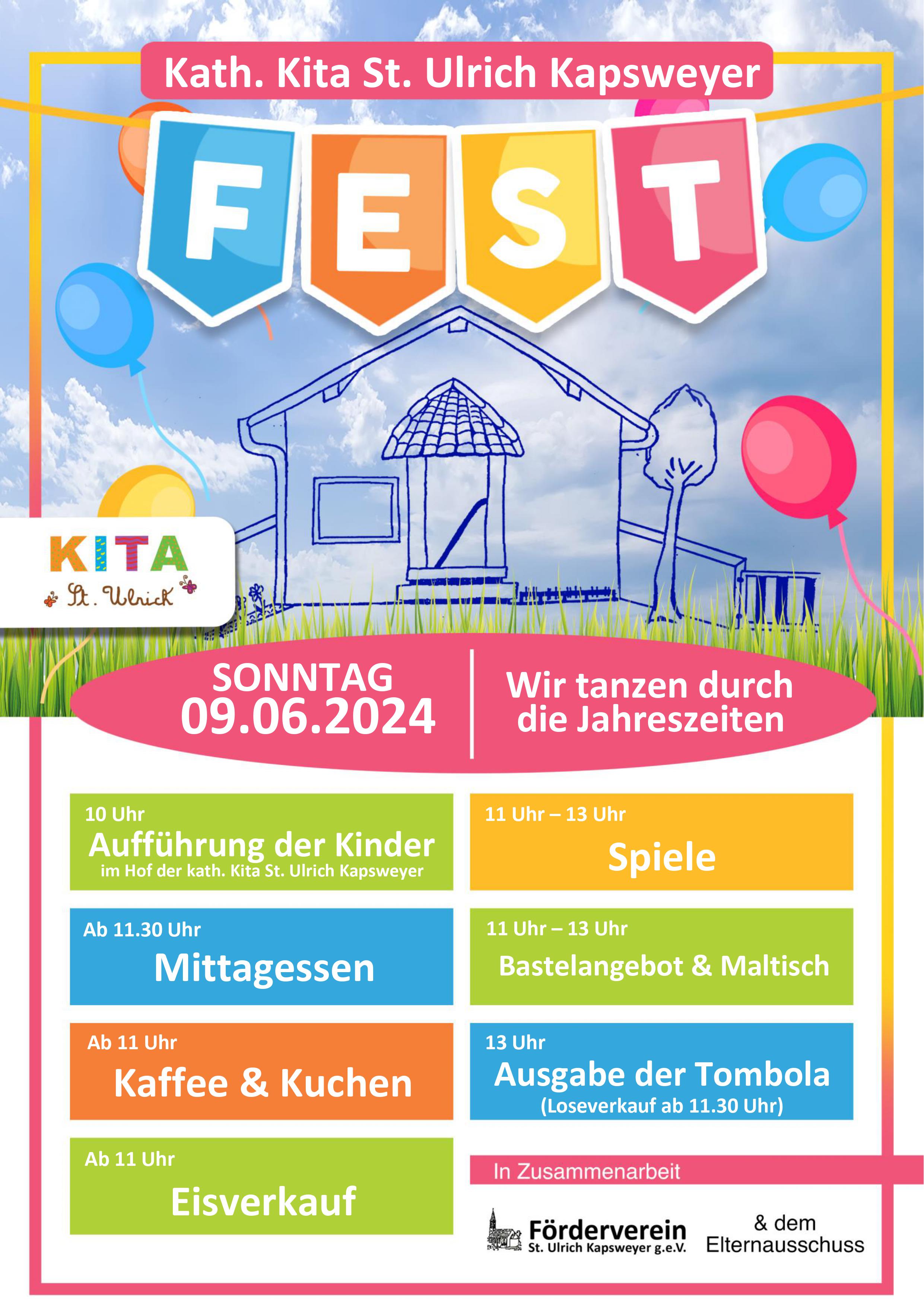 Am Sonntag, 9. Jun tanzt die Kita St. Ulrich Kapsweyer bei ihrem Kitafest durch die Jahreszeiten! Ab 10 hr erwartet die Besucherinnen und Besucher ein buntes Programm. Herzlich Einladung zur Mitfeier. Hier gibts alle Infos.