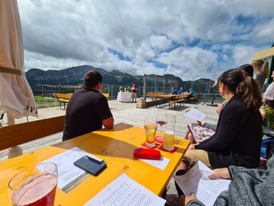 Die 1. Bergandacht der Hl. Elisabeth auf der Sonnalm auf 1740m Höhe im Salzburgerland war malerisch. Psalm 68 mit "Warum blickt ihr voll Neid, ihr hohen Gipfel, auf den Berg, den Gott sich zum Wohnsitz erwählt hat? Dort wird der Herr wohnen in Ewigkeit", öffnete den Andachtsteilnehmern den Blick nach oben. In ihren Gedanken zur der Bibelstelle ging Bianka Wüst darauf ein, immer wieder den Blick nach oben zu wenden, mit Beten und Bitten nie den Blick zum Ziel unseres Lebens zu verlieren. Wer leider nicht dabei sein konnte kann die Podcast-Folge vom Sonntag den 22.08.21 beim YouTube-Kanal "Chris und die Kirche" nachhören, in der es auch um diese Bibelstelle und den Blick nach Oben geht. So war der Aufstieg schon fast mit einem Kreuzweg vergleichbar, aber die Mühe hatte sich gelohnt. Oben angekommen, wie sollte es anders sein, erstrahlte die Sonne und es war für alle Teilnehmer ein kurzeitiges Innehalten und für manche, die zufällig vorbei wanderten, auch eine überraschende aber guttuende Stärkung in dieser schnelllebigen Zeit. Als kleine Erinnerung konnte jeder das Schlussgebet, welches gemeinsam gebetet wurde, als Gebetsbildchen mit nach Hause nehmen und wird so an den Moment erinnert: "Mein Blick geht nach vorne, ich geh Schritt für Schritt, vom Glauben zum Schauen, denn du gehst ja mit".