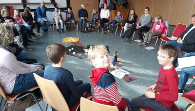 Am Karfreitag Morgen versammelten sich Kommunionkinder und Kinder aus den verschiedenen Gemeinden im Gäu im Dorfgemeinschaftshaus Böbingen, um auf ganzheitliche Art und Weise den Kreuzweg Jesu kennenzulernen und zu beten. Während der Erzählung des Leidens und Sterbens Jesu entstand in unserer Mitte ein Bild, gelegt mit Tüchern, Symbolen und biblische Erzählfiguren. Eindrucksvoll stand uns die damalige Situation in Jerusalem vor Augen. Am Ende durften die Kinder das Kreuz schmücken, als Hoffnungszeichen für die Auferstehung Jesu, die wir an Ostern feiern dürfen.