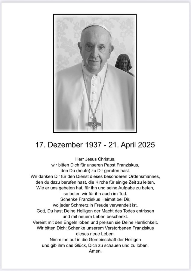 „Er hat uns gelehrt, die Werte des Evangeliums mit Treue, Mut und universeller Liebe zu leben, insbesondere zugunsten der Ärmsten und Ausgegrenzten. In großer Dankbarkeit für sein Beispiel als wahrer Jünger des Herrn Jesus empfehlen wir die Seele von Papst Franziskus der unendlichen barmherzigen Liebe des dreifaltigen Gottes."