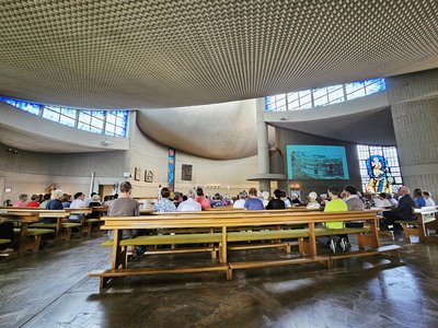 Am 17.08.1975 wurde die Kirche St. Barbara in Herbitzheim geweiht. Noch vielen sind das Fest von damals und der beschwerliche Weg bis dahin in Erinnerung. Ein halbes Jahrhundert Gotteshaus mit außergewöhnlicher Architektur und Anziehungspunkt im Bliesgau sollte besonders gefeiert werden. Der Gemeindeausschuss der Gemeinden Rubenheim/Herbitzheim und Bliesdalheim mit seiner Vorsitzenden Marita Nagel machte sich deshalb frühzeitig an die Planung des Jubiläums. Ein Festgottesdienst mit anschließender Begegnung auf dem Kirchenvorplatz, bei der die Menschen ins Gespräch kommen und sich über Gott und die Welt austauschen, war die richtige Idee für dieses Ereignis. Bei strahlendem Sommerwetter nahmen Gläubige aus der ganzen Pfarrei und darüber hinaus an einem Festgottesdienst teil, der lange in Erinnerung bleiben wird. Die Kirche empfing mit Gartenblumen von Gertrud Schwartz, kreativ und bunt von Margit Wesely und Otti Leiner gesteckt. Die Fülle der Schöpfung lockte bei vielen schon beim Eintreten ein staunendes „Oh, wie schön ist das!“, hervor.