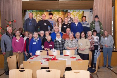 Gruppenbild: Die Ehrenamtlichen im Prälat-Walzer-Haus zusammen mit der Band "Die Losgelösten", eine Band aus dem Caritas-Förderzentrum St. Johannes & St. Michael, die später noch Musik machte.