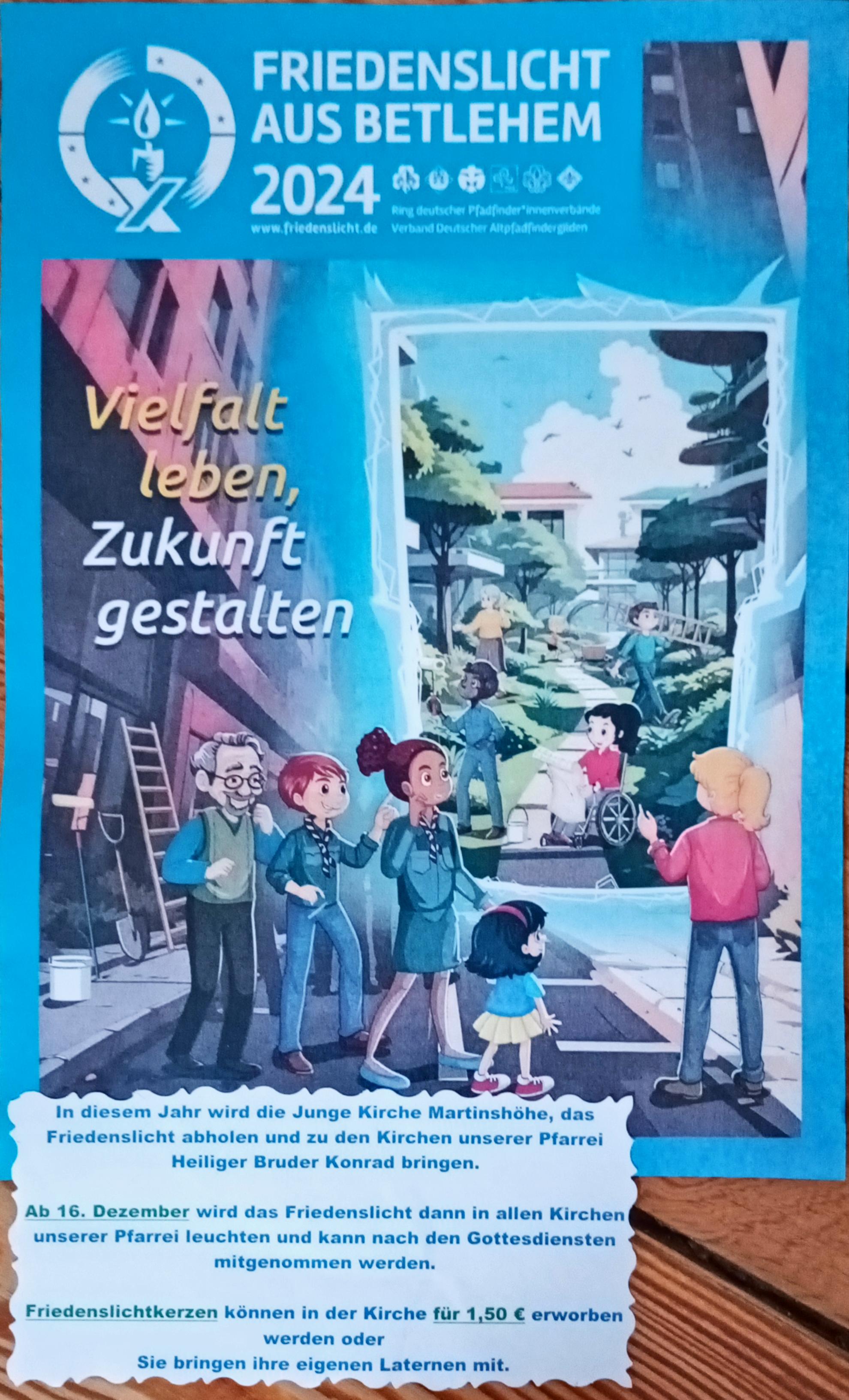 Die Juki Martinshöhe bringt in diesem Jahr das Friedenslicht in unsere Pfarrei. Ab dem 16. Dezember leuchtet es in den Kirchen unserer Pfarrei und kann nach den Gottesdiensten mitgenommen werden. Kerzen können für 1,50 € erworben werden oder Sie bringen ihre eigene Laterne mit.