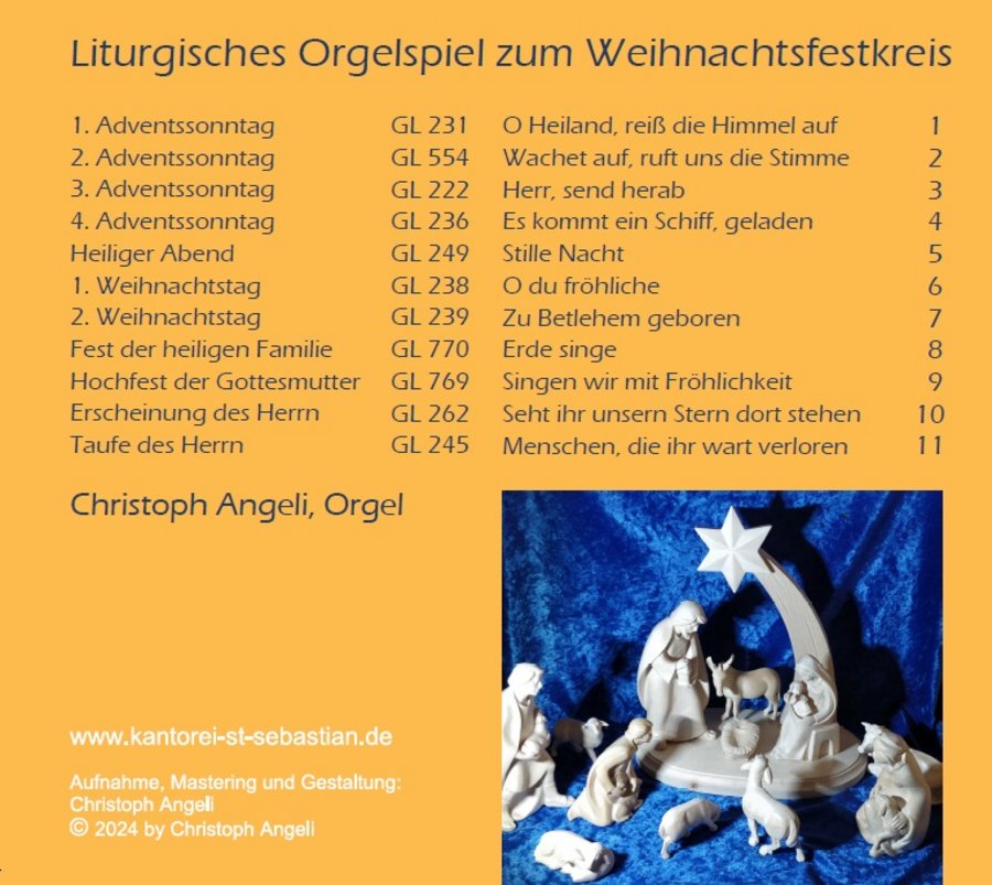 Christoph Angeli, Kirchenmusiker und Chorleiter in St. Sebastian, hat eine neue CD eingespielt. Auf dieser sind liturgische Orgelstücke zum Weihnachtsfestkreis zu hören. Die CD's sind ab sofort erhältlich im Pfarrbüro in Wredestraße oder am Schriftenstand in der Kirche St. Sebastian. Eine CD kostet € 5,--.