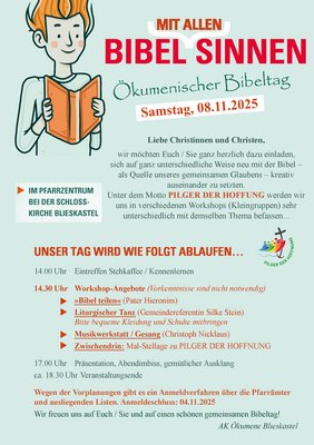 wir möchten Euch / Sie ganz herzlich dazu einladen, sich auf ganz unterschiedliche Weise neu mit der Bibel – als Quelle unseres gemeinsamen Glaubens – kreativ auseinander zu setzten. Unter dem Motto PILGER DER HOFFUNG werden wir uns in verschiedenen Workshops (Kleingruppen) sehr unterschiedlich mit demselben Thema befassen...
