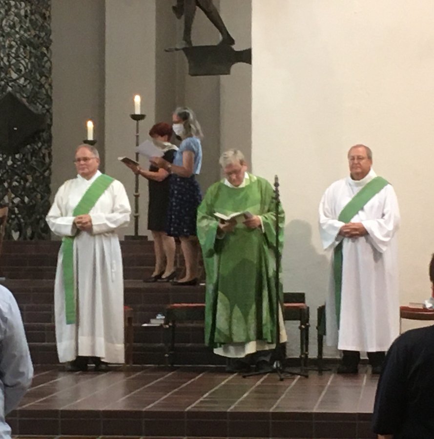 Aufgrund der Corona-Zeit konnte die Verabschiedung nicht öffentlich angekündigt werden. Dennoch waren die verfügbaren Plätze in der Kirche Herz Jesu komplett belegt. Neben Pfarrer Alban Meißner und Diakon Hubert Münchmeyer komplettierte Diakon Matthias Reitnauer (zuständig für die Diakone seitens der Diözese) den liturgischen Dienst.