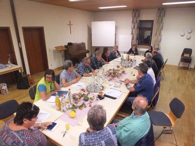 Einige Tage später traf sich der Gemeindeausschuss mit dem Presbyterium. Nach längerer Zeit und Neuwahlen beider Gremien im letzten Jahr war es Zeit für ein gemeinsames Treffen. Nach lockerem Beginn bei einem Glas Sekt oder Saft ging das Gespräch in prot. Gemeindhaus weiter. Auf der Tagesordnung standen neben Kennenlernen und Austausch auch die Vorstellung der jeweiligen Strukturen. In Kleingruppen erarbeiteten die Ratsmitglieder welche ökum. Aktionen/Gottesdienste zur Zeit schon bestehen und eine Ideenschmiede für weitere ökum. Projekte beendete die Arbeitseinheit. Das Abendgebet rundete den gelungenen Abend ab.
