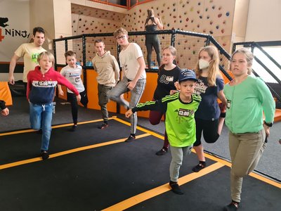 Danach machten wir uns auf den Weg zur Jump4all Trampolinhalle. Nach der Sockenausgabe und einer Regelunterweisung hatten alle viel Spaß. Dies könnt ihr auch auf den Bildern sehen: Vorher noch beim Aufwärmen mit normaler Gesichtsfarbe und beim Gruppenbild hatten alle eine sehr gesunde rote Gesichtsfarbe. Die Zeit war sehr knapp bemessen und nachdem die Jump4all Trampolinhalle so gut ankam, haben wir damit schon einen Programmpunkt für nächstes Jahr vorgemerkt.