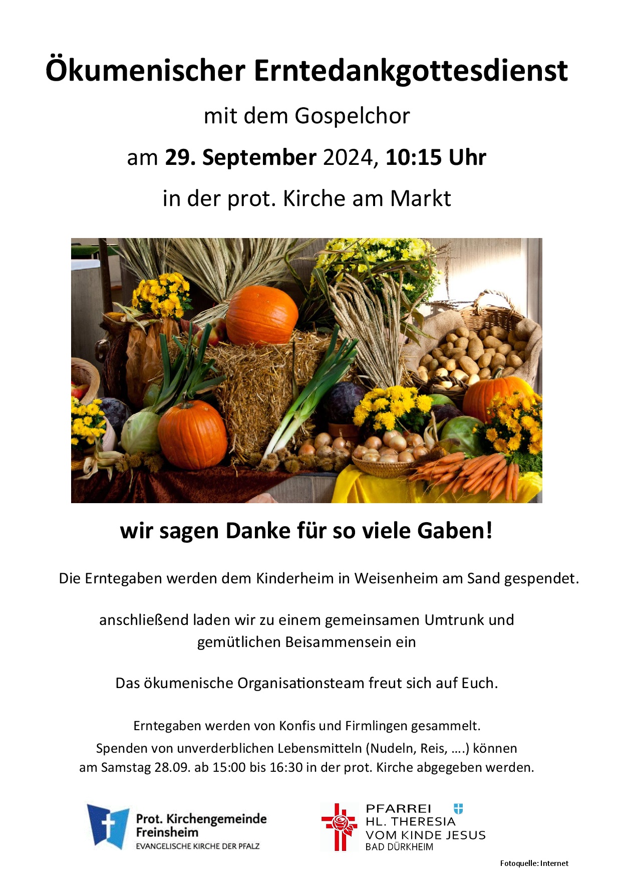 Spenden von unverderblichen Lebensmitteln (Nudeln, Reis, ...) können am Sastag 28.09.24 um 15.00 bis 16.30 Uhr in der prot. Kirche abgegeben werden.