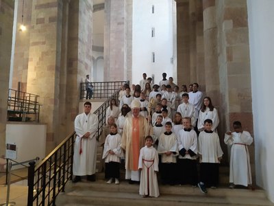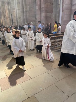 33 Ministrant*innen und 3 Oberministranten machten sicht am vergangenen Sonntag mit 8 Begleiter*innen schon früh auf den Weg: kurz nach 8 Uhr fuhr die S-Bahn nach Speyer ab. Erste Etappe des ersten gemeinsamen MINI-Ausfluges: der Aussendungsgottesdienst unserer bisherigen Gemeindeassistentin Alina Menzel. Bereits am Freitag hatten sich die MINI's in der Kirche St. Ludwig getroffen, um miteinander zu proben. Und die Überraschung für Alina Menzel ist gelungen: ein beeindruckendes Bild und Erlebnis für die MINI's, bei einem solch feierlichen Gottesdienst mit in den Dom einzuziehen und die Aussendung aus nächster Nähe beobachten zu können.