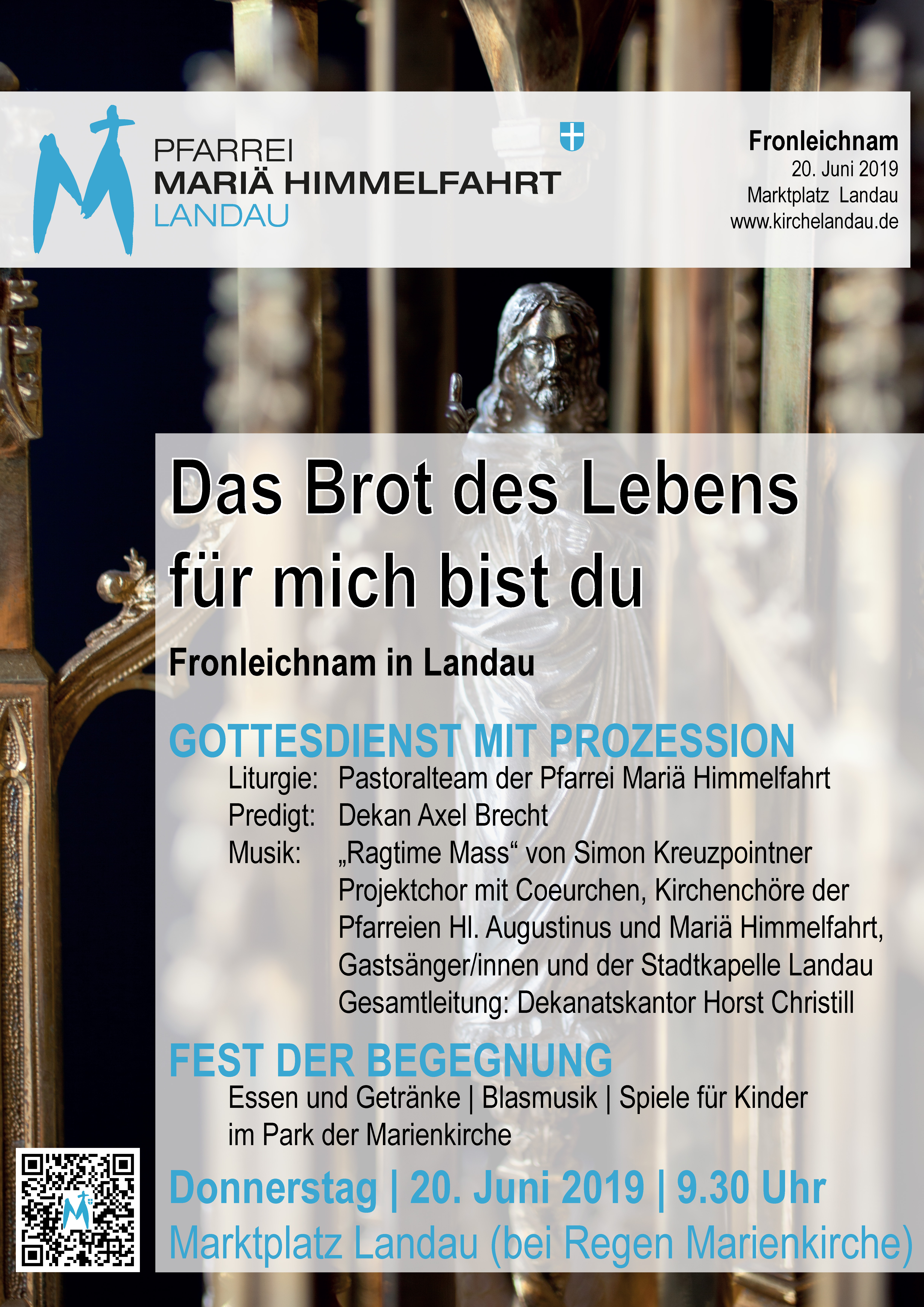 Der Liturgiefeier steht Dekan Axel Brecht vor, den Gottesdienst gestalten die Gemeindereferenten Bärbel Grimm und Artur Kessler sowie Kaplan Christoph Herr zusammen mit den Kommunionkindern mit. In der Ansprache gibt Dekan Brecht, ein Bäckersohn, einen spirituellen Impuls zum Thema des diesjährigen Fronleichnamsfestes "Das Brot des Lebens für mich bist Du". Beim Gottesdienst bietet die moderne "Ragtime Mass" von Simon Kreuzpointer ein musikalisches Highlight. Ein Projektchor mit dem Coeurchen, Kirchenchören der Pfarreien Hl. Augustinus und Mariä Himmelfahrt, Gastsänger/inner und der Stadtkapelle Landau (Dirigent Bernd Gaudera) musizieren unter Gesamtleitung von Dekanatskantor Horst Christill.