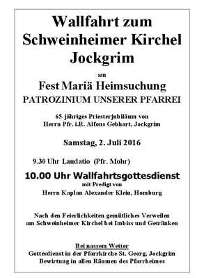 Wir laden schon heute alle Pfarrangehörigen ganz herzlich zur Mitfeier des Wallfahrtsgottesdienstes um 10 Uhr am Schweinheimer Kirchel in Jockgrim ein.