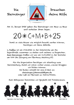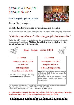 Liebe Eltern, Die Sternsingeraktion 2025 steht wieder an. Für die Aktion werden Kinder gesucht die sich als Könige verkleiden und durch die Straßen von Haus zu Haus gehen.