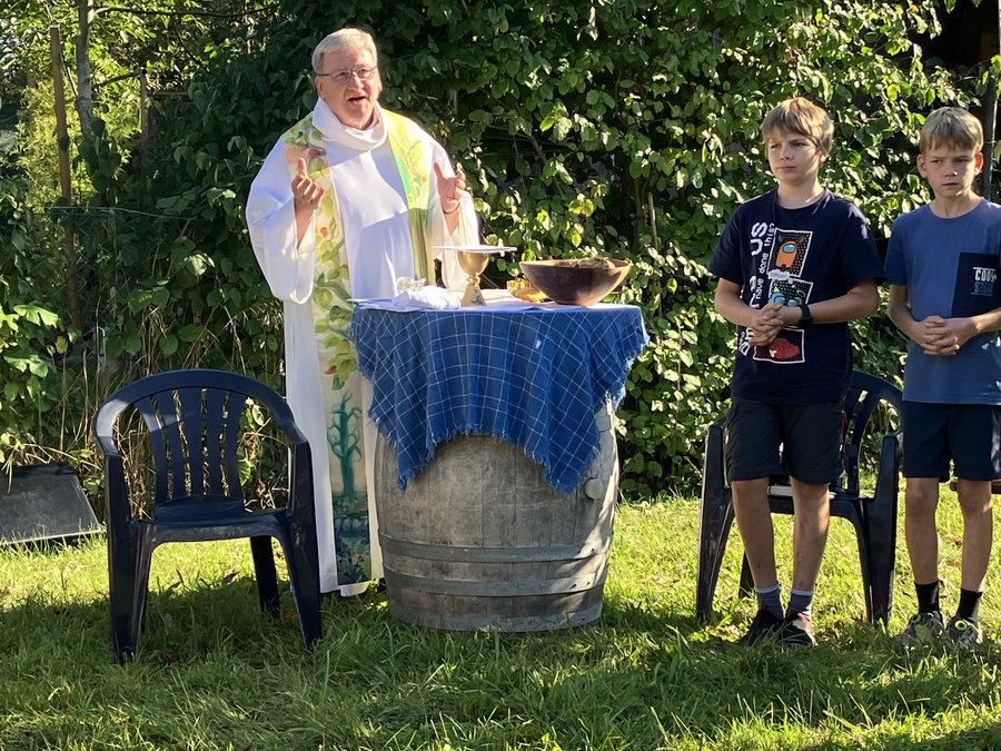 Nach einer Verschnauf- und Imbisspause mit leckeren Muffins trafen sich dann die jweiligen Gemeindegruppen: dabei wurden unter anderem die Probentermine besprochen, auch die von Gottesdiensten, die etwas Besonderes sind, wie beispielsweise die Firmung Anfang Oktober oder der große MISEREOR-Eröffnungsgottesdienst in St. Ludwig im Februar kommenden Jahres. Gemeindereferentin Simone Hartner und Pfr. Alban Meißner luden alle Ministrant*innen ein, bei diesen Gelegenheiten das Gemeinschaftsgefühl des Miteinander-Dienens zu erleben. Dann wurde für den Gottesdienst gerichtet, zu dem sich alle im hinteren Teil des Garten in einer großen Runde versammelten. Begleitet von Christoph Angeli am Klavier sangen alle begeistert mit. Pfr. Alban Meißner verzichtete auf die Predigt und erklärte stattdessen an diversen Stellen des Gottesdienstes die besonderen Dienste der Ministrant*innen. Besonderheit bei der Kommunion war, dass ein am Nachmittag selbst gebackenes Fladenbrot gebrochen wurde.