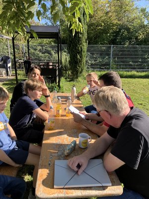 Das Mini-Fest vor 2 Jahren war ziemlich verregnet. Ganz anders in diesem Jahr: am 24. September 2023 konnten Gemeindereferentin Simone Hartner und Pfr. Alban Meißner rund 25 Mnistrant*innen plus ca. 10 Betreuer*inen aus allen Gemeinden der Pfarrei Hll. Petrus und Paulus im Garten der Familie Wallacher gegenüber der Großen Blies begrüßen. Nach einer Kennenlernrunde wurde in Kleingruppen Maßarbeit bewiesen: die Gruppenmitglieder hatten die Aufgabe, ein Maßband ohne dies fallen zu lassen bzw. auch ohne sich abzusprechen, auf dem Boden abzulegen: Schwierigkeit dabei war, dass jede/r Einzelne jeweils nur einen Finger unter das Maßband legen durfte und dieses dann von der Gruppe gemeinsam auf den Boden "balanciert" wurde. Alle Gruppen schafften dies mit Bravour!