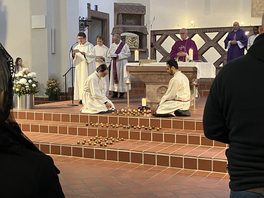 Diakon Hubert Münchmeyer und die Gemeindereferentinnen Simone Hartner und Renate Kröper verlasen die Namen der 76 Personen, die seit dem Allerseelentag 2024 verstorbenn sind. Für jede/n von ihnen wurde eine Kerze zum Gedenken entzündet. Am Ende des Gottesdienstes wurden die Angehörigen eingeladen, die Kerzen mit nach Hause zu nehmen.