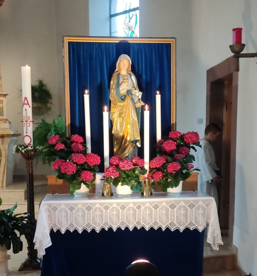 Ein schönes rundes Jubiläum konnten wir in diesem Jahr in Bliesdalheim feiern. Die Lourdes-Grotte wurde 100 Jahre alt. Ein Nachweis findet sich im Buch "Die Geschichte der Bliesdalheimer Kirchen und Schulen", in dem der Arbeits- und Förderverein für Bliesdalheimer Dorfgeschichte e.V. die Einträge im Pfarrgedenkbuch der Katholischen Pfarrei Bliesdalheim aufgearbeitet hat. Danach wurde die Grotte am 1. Sonntag im Mai 1923 geweiht. Dieses Jahr am 6. Mai jährte sich das Ereignis zum 100.Mal. Da das Weihedatum auf einen Samstag fiel, feierten wir das Jubiläum in der Vorabendmesse in der Bliesdalheimer Kirche mit Statio an der Grotte. Blumenfrau Christine Rabung hatte mit viel Liebe die Lourdes-Grotte geschmückt, sodass sie in besonderem Glanz erstrahlte. Auch der Maialtar in der Kirche ist immer ein absoluter "Hingucker" für die Kirchenbesucher/innen im Marienmonat Mai. Vielen herzlichen Dank für den schönen Blumenschmuck zu Ehren der Mutter Gottes!